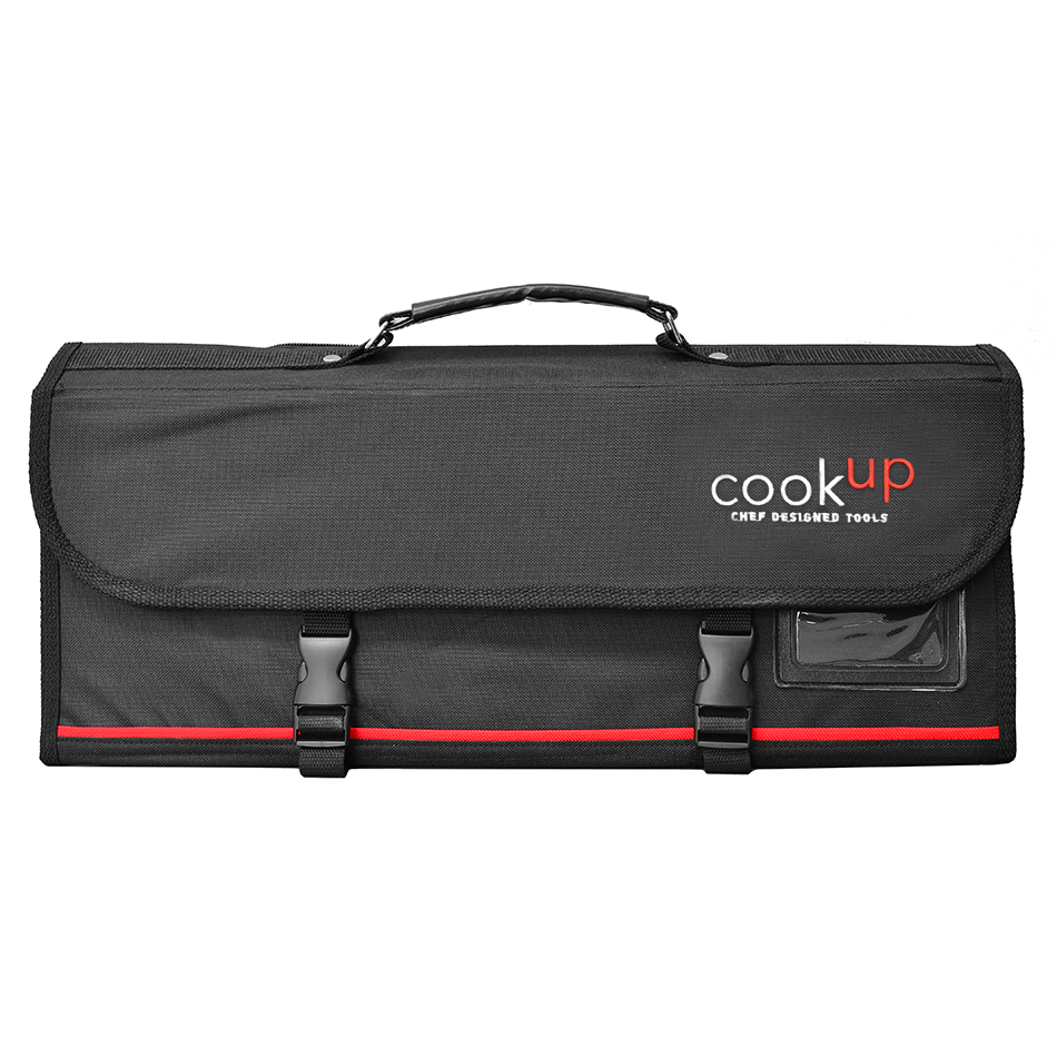 This roll bag features a 17-piece capacity with durable lining, multiple compartments, zipper pockets and are complete with a sturdy carrying handle and detachable shoulder strap. CookUP logo is embroidered on the front panel of the bag.