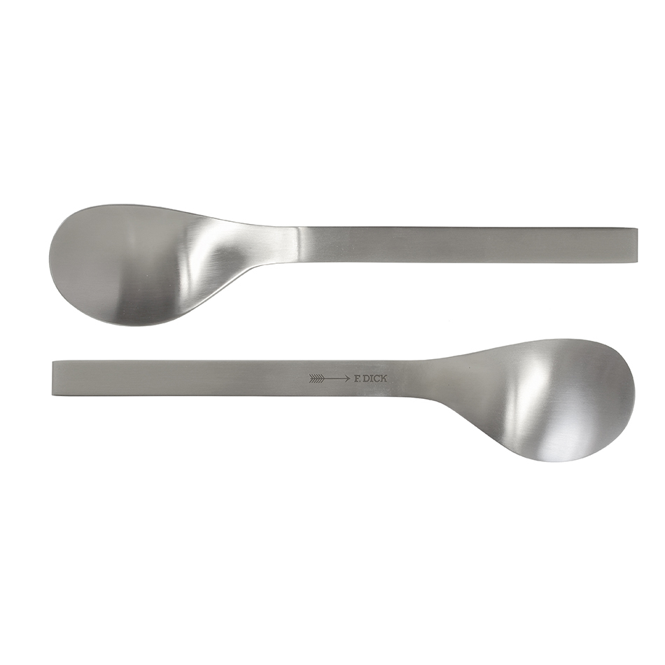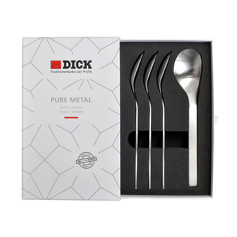 With a focus on purist industrial design, the PURE METAL tablespoon stands out with its unusual shape and follows the clear lines and design of the PURE METAL series knife and fork. The PURE METAL tablespoon has a silky matt surface in tried-and-tested steel quality. The distinctive bowl of the tablespoon is ideal for soups, stews or even desserts. The weight of the spoon is evenly distributed so that it is well balanced and comfortable in the hand. Originally, spoons were completely round, modelled on a hollow, cupped hand. This has changed over time into the oval shape that they are today. F.DICK enhanced the shape again to fit with the typical asymmetric design of the PURE METAL series. At first glance, the shape is uncharacteristic, but immediately impressive and familiar when used for the first time.